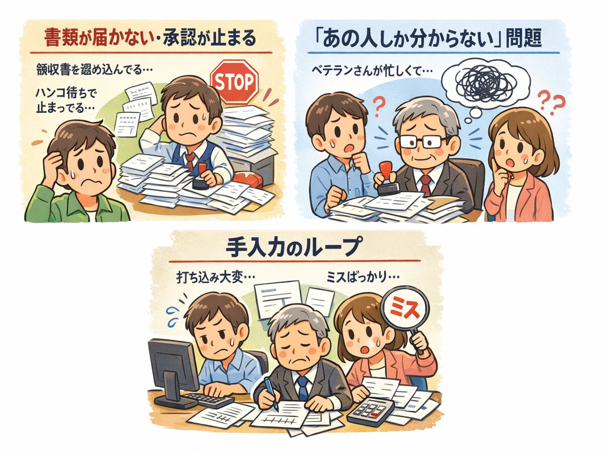 書類が届かない・承認が止まる: 現場の担当者が領収書を溜め込んでいたり、部長のハンコ待ちで数日ロスしたり……。